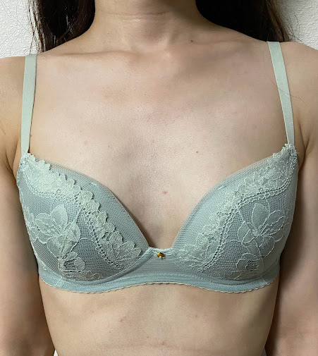 ワイヤーがないにもかかわらず、アンダーバストがしっかり支えられている感覚があり、胸を寄せたあともしっかり形をキープしています。胸がつぶれるようなこともなく、まさにふっくらという感じです。(私は胸が小さいのであまりきれいな谷間はできませんが、胸がある方はくっきり谷間ができると思います!)
